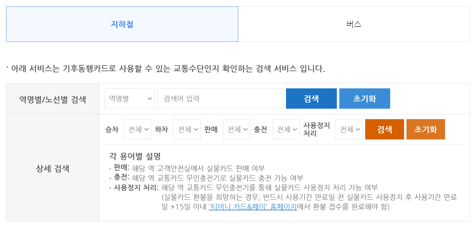 ✔ 사용정지 처리 : 해당 역 교통카드 무인충전기를 통해 실물카드 사용정지 처리 가능 여부 알 수 있습니다.
